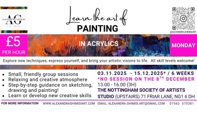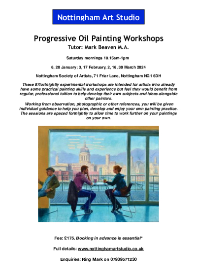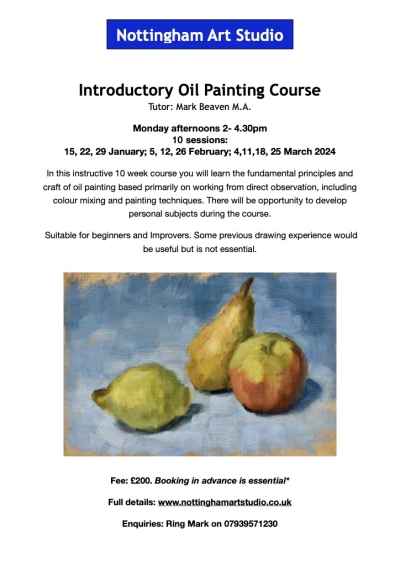 Suitable for beginners and Improvers. Some previous drawing experience would be useful but is not essential. Full details: www.nottinghamartstudio.co.uk