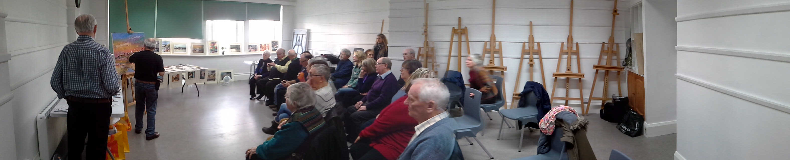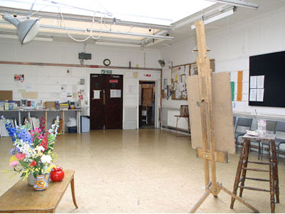 On the second floor, a large, naturally lit, fully equipped studio. Facitilies include kitchen and cloakrooms, easels, tables, chairs, screens, lighting, heating, dais, and pose setting furnishings. When not in use for Society painting groups the room may be hired for workshops, etc from £40 per session (morning/afternoon/evening).