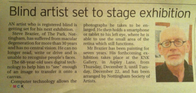 Artist Steve Brazier is the next member to exhibit at the KNK Gallery (358 Aspley Ln, Nottingham NG8 5GB). Below is a press cutting from the Nottingham Post about his work and the exhibition.